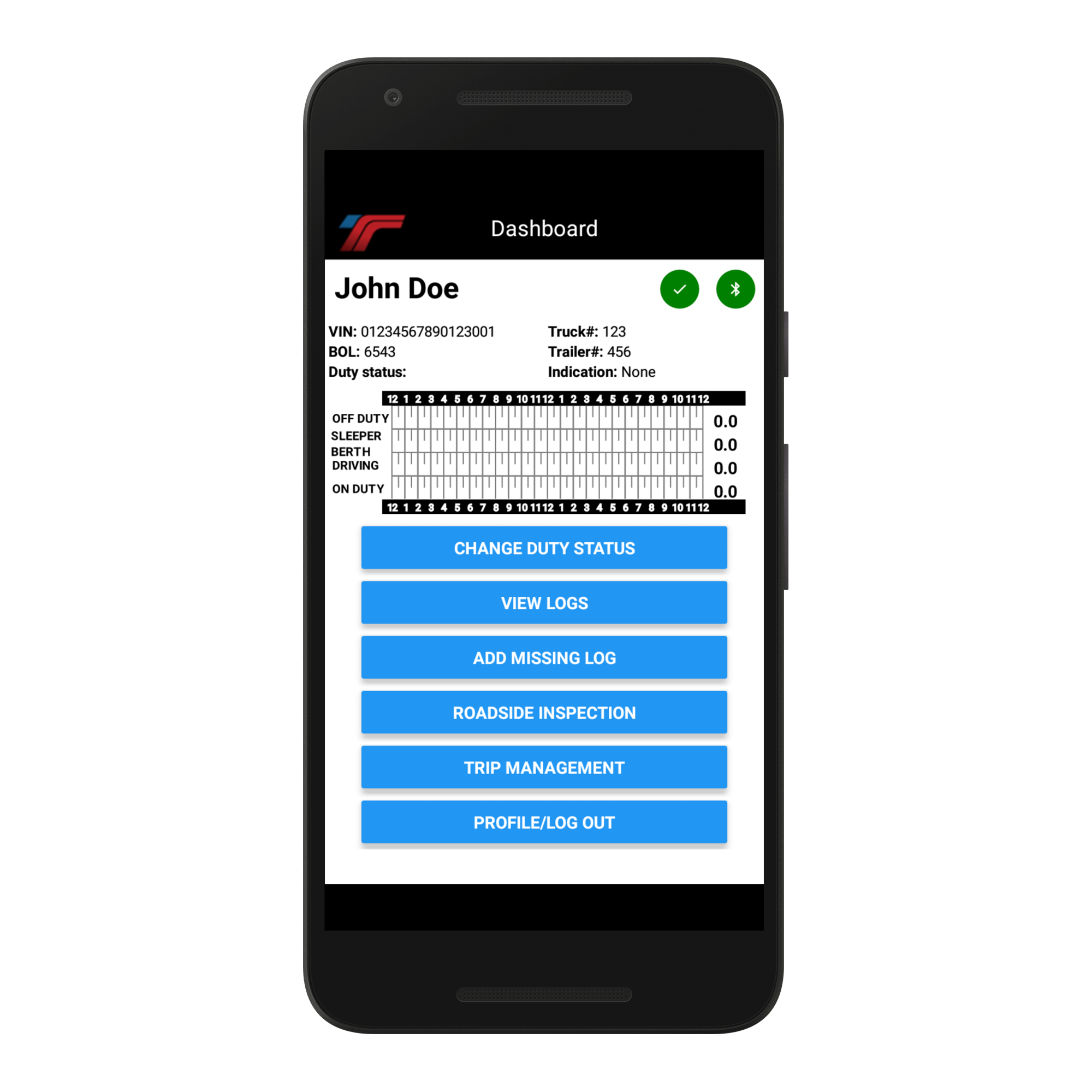 | TRUE ROAD ELOGS | TRROLG-01X | 2.18.12 or above | TRE01X | Download | Download | True Road Elogs | 5409932541 | trueroad11@gmail.com | http://www.trueroadeld.com | 16 wild rose drive , Fredericksburg/virginia/22406 | Telematic (Web Service, Email) | During roadside inspections, the TRUE ROAD ELOGS becomes a valuable companion for drivers by providing a comprehensive overview of their records. Accessing this information is easy within the app, and the ELD simplifies the transfer of telematics data via email or web services. Initiating the transfer process is straightforward for drivers who can navigate to the DOT Mode menu and choose the "Send" button. Additionally, a dedicated DOT Mode button ensures drivers can conveniently showcase the logs report on their mobile device while presenting it to a DOT officer. | The TRUE ROAD ELOGS Malfunction and Diagnostic Event Records record all malfunctions that occurred during the relevant time period and relay active malfunctions to all ELD users. With the goal of maintaining compliance, detecting malfunctions and data inconsistencies, and documenting such occurrences, the TRUE ROAD ELOGS system employs specific codes to classify compliance malfunctions and diagnostic events, such as: ■ P for "Power compliance" malfunction, ■ E for "Engine synchronization compliance" malfunction, ■ T for "Timing compliance" malfunction, ■ L for "Positioning compliance" malfunction, ■ R for "Data recording compliance" malfunction, ■ S for "Data transfer compliance" malfunction, ■ O for "Other" ELD-detected malfunctions, ■ 1 for "Power data diagnostic" event, ■ 2 for "Engine synchronization data diagnostic" event, ■ 3 for "Missing required data elements data diagnostic" event, ■ 4 for "Data transfer data diagnostic" event, ■ 5 for "Unidentified driving records data diagnostic" event, ■ 6 for "Other" ELD-identified diagnostic events. | The TRUE ROAD ELOGS product has been diligently tested and successfully fulfilled all the criteria specified in the FMCSA's Requirements Traceability Matrix, and pilot testing has validated its effectiveness and adherence to regulations during real-world usage. TRUE ROAD ELOGS is able to confirm that it meets the requirements of 49 CFR Part 395 Subpart B, including the accurate logging and transmission of hours of service data. |