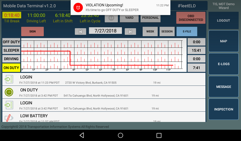 | Voyager II ELD | ANDA317 | 1.2.70.0A or higher | ISE001 | Download | Download | Transcor Data Services | 904-737-7500 | info@tdstickets.com | http://tdstickets.com | 9310 Old Kings Rd S, Ste 404, Jacksonville, FL 32257 | Voyager II ELD will use Wireless Web Services and email for our method of data transfer. The driver will use the Options feature in our application, tap on a button to send logs to enforcement that will initiate the procedure. | An ELD compliance malfunction appears on our device as a pop-up notification icon that sits on top of all applications. The icon will include the malfunction description. A compliance malfunction cannot be dismissed, it must be corrected before continuing to use the device as an ELD. Malfunction Code P = Power -- Device lost power during driving events for a total of 30 min or more over a 24-hour period Malfunction Code E = Engine synchronization -- Device lost connection to the ECM (or other data source) for a total of more than 30 min during a 24-hour period Malfunction Code T = Timing -- Device is not able to synchronize to UTC Malfunction Code L = Positioning -- Device is not able to acquire a valid position measurement within 5 mi of vehicle movement for a total of more than 60 min over a 24 hour period. Malfunction Code R = Data recording -- Device is no longer able to record or retain required event data or retrieve locally-stored recorded logs Malfunction Code S = Data transfer -- Device continues to fail checks of the roadside transfer mechanism for three days following a Data Transfer Diagnostic Event Malfunction Code O = Other ELD detected -- The Voyager II application has stopped working or is not responding as expected | The Voyager II ELD system complies with and is tested against the United States Department of Transportation (USDOT) Federal Motor Carrier Safety Administration (FMCSA) specifications as found in 49 CFR Part 395 for Electronic Logging Devices, Subpart B. | |